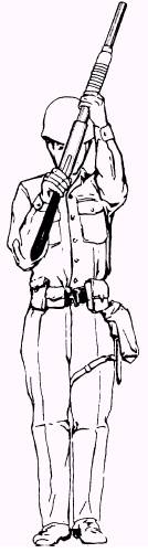 Figure 9-2.-Mob dispersal techniques used properly. Riot control agents should not be used in hospital areas or other areas when undesirable effects may result from their use. Only designated and trained personnel should use riot control agent dispersers. POSITIONS FOR WEAPONS The civil disturbance control force should hold their weapons as prescribed by the commander. The methods include safe port position, safe guard position, and on guard position. Safe Port The "safe port" position is shown in figure 9-3. This position is extremely useful in making a show of force. In this elevated position, weapons can be seen by the participants in the middle or rear of a group. The sight of these weapons can create an impression of strength and superiority. However, control force members should not be required to maintain the position for extended periods of time, as it is very tiring. Safe Guard The "safe guard" position (fig. 9-4) is one of semi-readiness. It is less tiring than the "on guard" position and should be used to rest the control force when circumstances permit. For example, as the control force advances, they should maintain the "safe guard" position until just before contact is made or resistance is expectected and then be ordered to the "on guard' position. The "safe guard" position can also be used when pursuing a crowd withdrawing without resistance.