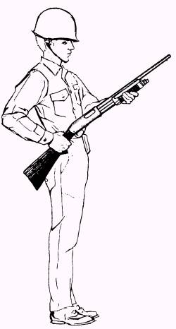 FORMATION INTERVAL Experience has shown that formations, to be effective, must be tailored to meet the situation. The members of a formation are usually separated by a one pace (30-inch) interval, but this spacing might not be sufficient in some situations and may need to be expanded or reduced. Some police forces have discovered that a greater interval makes members less susceptible to injury from thrown objects and a tighter interval reduces infiltration possibilities. The control force commander should adjust the formations to fit the needs of the particular situation. Figure 9-2 illustrates various ways that crowds and mobs can be dispersed in different situations. For example, in part A of figure 9-2, the attacking force is using an echelon right formation to move a crowd away from a public building. In parts B, C, D, and E of figure 9-2, other formations in various conflgurations are shown. Complete information and instruction of the use of formations, oral and visual commands, and organization of crowd control formations is contained in the U.S. Army Field Manual 19-15, Civil Disturbances. FORMATION WEAPONS AND CARRY POSITIONS LEARNING OBJECTIVES: Identify and describe the weapons used in control formations. Explain how to properly use riot control agents. Demonstrate three carry positions for weapons in control formations. Weapons used in formations include the riot baton and the riot shotgun. Other weapons that may be used in a sophisticated situation are sniper rifles, hand guns, and riot control agent dispersers. In this section, we will also look at how the weapons should be held while in formation. But first, let's look at the weapons themselves. THE RIOT BATON The riot (36-inch) baton is most effective in a crowd control operation and is the primary weapon for such operations. The baton is an offensive weapon with reduced lethality and, unlike the shotgun, the loss of a baton to the crowd does not create a serious threat. The riot baton may also be used in combination with the shotgun by having the control element confronting the crowd armed with riot batons and the support element armed with shotguns. If the riot baton is not available, nightsticks or patrol batons (22- to 26-inch) may be substituted, but with reduced effectiveness. THE RIOT SHOTGUN The riot shotgun is an extremely versatile weapon and is the primary individual weapon. The shotgun's appearance and capability produce a strong psychological effect on rioters, and it is particularly suited to certain applications in civil disturbance operations. When used with No. 00 buckshot, it is effective at limited range; however, use of No. 00 buckshot should be limited to specific missions. RIOT CONTROL AGENTS Riot control agents have a high safety factor and will not seriously endanger health or cause death when