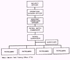 Figure 12-1.-Patrol organization. understaffed, adjustments to the organization must be made. For example, the Patrol Watch Commander may absorb the duties of the Patrol Supervisor, or eliminate the Assistant Operations Officer, or both. The duties of the patrol division are listed in the following paragraphs. SECURITY OFFICER The security officer is responsible for organizing, training, and directing the command's police and guard forces sufficient to protect, react to, and confront situations and circumstances which threaten personnel and property. OPERATIONS DIVISION OFFICER The operations division officer is appointed by, and is responsible to, the security officer for the following: 1. Overall performance of the patrol division. 2. Training and welfare of all assigned personnel. 3. Enforcing all applicable laws, rules, and regulations. 4. Maintaining all required records, reports, and files. 5. Assigning qualified personnel to guard and patrol duties and maintaining a record of such assignments. 6. Maintaining various statistics and interpreting data to keep the security officer informed on the status of the patrol division. 7. Reviewing daily all incident complaint reports and preparing a brief of significant events (usually from the security desk journal) for the security officer. In addition, the operations division officer may prepare and keep an up to date map of the entire area covered by the patrol division. This map can show the routes covered by each patrol, off limits areas, and other areas of significance. A bulletin board may be used for posting special orders for each patrol, photographs and descriptions of wanted persons, and other items of interest to the patrols. PATROL WATCH COMMANDER The patrol watch commander is under the direct supervision of the operations division officer or assistant operations officer, if assigned. The patrol watch commander is responsible for law enforcement and security of the activity during the period of the watch. The duties and responsibilities of the patrol watch commander are as follows: 1. Ensuring that the patrol duty section personnel maintain a smart and correct military appearance at all times. 2. Instructing members of the watch of their duties and responsibilities and ensuring that all assigned tasks are carried out in a professional manner. 3. Ensuring that all trainees are assigned to the watch section field training officer (FTO) for proper indoctrination and training. 4. Ensuring the safeguarding of persons placed in detention. The watch supervisor (or turnkey if assigned) ensures that, when a person is searched, all applicable instructions pertaining to searches are complied with and that booking and required log entries are made. 5. Reviewing all incident complaint reports ensuring they are complete and concise and submitted to required authorities in a timely manner. 6. Making frequent inspections of persons apprehended, ensuring that no unnecessary bodily contact is made. 7. Making frequent inspections of the security department headquarters. 8. Responsible during the watch period for all equipment and items under the custody and control of the patrol section, such as weapons and patrol vehicles. |