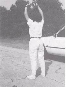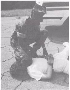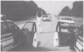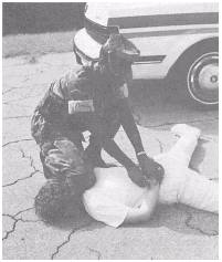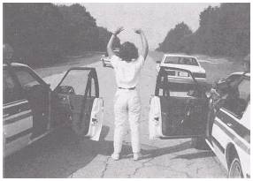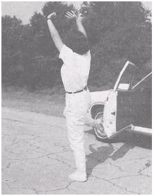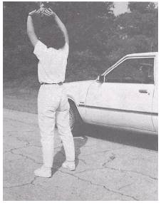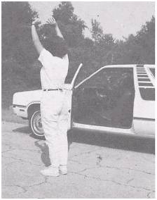 193.179 The driver will then be ordered to slowly turn around, facing the rear of the patrol vehicles, and moving to a position near the rear tires. The second responding MA will concentrate on the driver; the senior MA will continue to observe the suspect vehicle. At this time the driver will be ordered to a prone position on the roadway with legs spread wide apart and hands behind their back. The second MA will immediately handcuff the driver and then search the suspect. Proper procedures for the prone search should be followed. (If the suspect is a female, and no female officer is present, a patdown search only may be done by a male officer.) The different types of searches will be discussed later in this chapter.