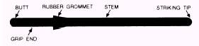 POLICE BATON The police baton is a highly effective and versatile individual defensive weapon. It allows the user to maintain a defensive nonaggressive posture. The baton is to be used in a quick reaction defensive mode as an extension of the arm and hand and is used primarily to poke or jab. It is also used to apply come-along holds. Some of the advantages of the police baton are the following: 1. The baton is immediately responsive to the minimum force requirement. 2. It can be rapidly removed and immediately used with one hand. 3. It can be effectively used in riot control formations. 4. The dimensions of the baton are constant throughout, thus eliminating any weak point. The use of the police baton is presently being taught at MA training school at Lackland Air Force Base. Marine cadres attached to security departments are also available to provide proper training. The police baton is 26 inches long, constructed of high-density, straight-grain, second-growth hickory or oak, or of high-impact plastic. It is 1-1/4 inches in diameter, rounded at both ends, and weighs no less than 15 but no more than 18 ounces. The baton is equipped with a snug-fitting rubber grommet positioned 8 inches from one end of the baton (fig. 12-3). A 1 1/2-inch-diameter ring holder is provided which is attached to the belt by means of a short leather strap.