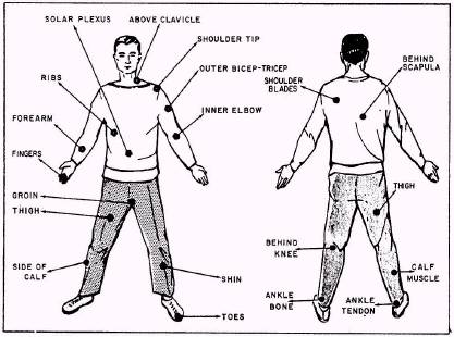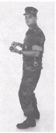 Figure 12-4.-Assumed position. the ground. You have now taken the "assumed position." The following directions apply to persons that are right-handed as shown in figure 12-4; the position of the legs are reversed for left-handed persons. If you are facing an offender, place yourself about one arm's length away from your opponent's right side, at an angle of about 45. Your left leg should be slightly forward and slightly bent. Your right leg should be vertical, with most of your body weight on this leg. From the "assumed position," all striking movements described will provide an instantaneous response, for defense as well as offense. Striking Areas When using the baton, strike at the fleshy areas of the body (such as the buttocks, arms and legs); other striking areas are the joints (elbows, knees, and wrists) and the bones (forearms, shin). Do not strike the head, spine, tailbone, or upper solar plexus (area just above pit of stomach). Blows to these areas could cause death or great bodily harm. Remember that the baton is an extension of your arm. The vulnerable points of the body in which impact with the baton should be made are depicted in figure 12-5.