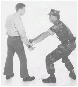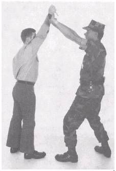 strike in any direction with minimum motion and effective speed. The following two variations of come-alongs are an effective means of taking an offender from the scene of an apprehension should the offender refuse to come along. Even though these holds are simple, you must remember that to obtain proficiency, you must practice and maintain efficiency. REAR ARM BAR.- From the interview stance, slip your left hand (thumb up) under the offender's right arm, with the back of your left wrist pressing against the inside of the offender's right elbow. With a slight turning motion to your right while on the ball of your left foot, bend the offender's right forearm upward toward his/her left shoulder. At the same time, slip your left hand high enough to lock his/her right elbow by grabbing the upper arm. Now secure your hold of the suspect in one of two ways. Put your right arm around the front of the suspect's neck and grab the left shoulder. Another effective measure is to pull his or her head backward by pulling the hair until the suspect is on his or her toes. One word of caution, when you practice with your partner, be careful as this hold, and the one described in the following paragraph can be painful. PRESSURE POINT BAR.- This come-along is extremely simple but effective if applied properly. There are two key points you must remember when applying this hold. First, you must know how to locate a pressure point. One is about 2 inches past the elbow toward the armpit area. The second thing to remember is when you put your arm over and around the suspect's arm, use the bony part of your forearm to apply the proper pressure to the pressure point. This hold is applied when, if in the interview stance, the offender turns away from you, or if you have approached the offender from the side in a confrontation situation. Grab the opponent's left wrist from the inside, pulling it slightly towards you, so that the arm is away from the body, and the palm in an upward position. Swing your right arm over the person's upper arm (just past the elbow) locking your hand against your chest. Now apply pressure on the suspect's arm by forcing it downward and twisting the wrist. Once the pressure point is applied correctly, the suspect will be on his or her toes, and the body will be arched backwards.