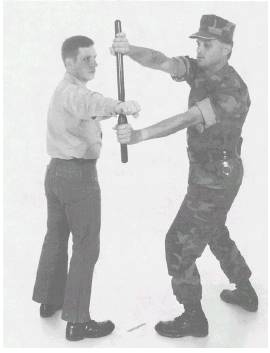 Defensive Movements All the defensive movements described here begin from the assumed position. They provide you an instantaneous response to an attack, and effective methods for quickly discouraging a violent offender. CHEST OR OVERHAND ATTACK.- Your suspect has drawn a knife and is coming at you with an overhead, downward thrust towards your chest. As the offender's arm is coming down, bring your arms up and out as shown in figure 12-6. This must be done in a quick snapping (hard thrust) motion. Your striking area should be between the offender's wrist and forearm. Between the combination of the offender's downward thrust and your upward snap, blocking it, this action will cause the offender to drop the knife. (NOTE: Be careful in practice. As you will find out, just doing this slowly will bruise your partner. If done with enough force, you could break your partner's wrist). If you need to follow through after blocking, bring the baton around to your right in a circular motion, and strike at either the chest or kneecap area. UNDERHAND THRUST ATTACK.- If the offender starts an upward thrust, slam your arms downward at an angle, striking the offender's wrist area