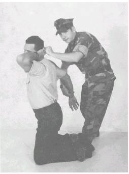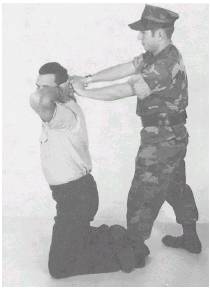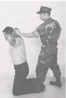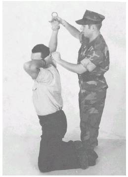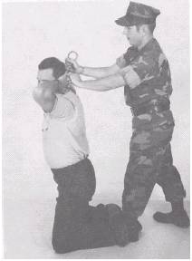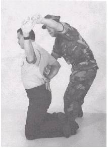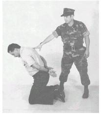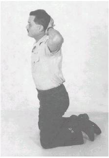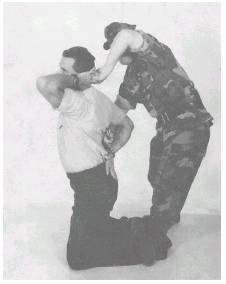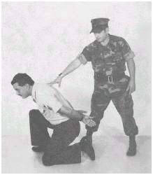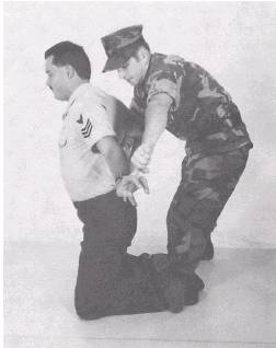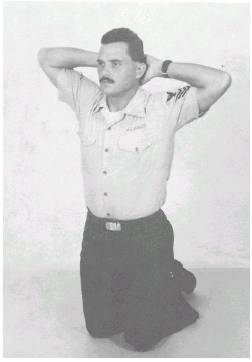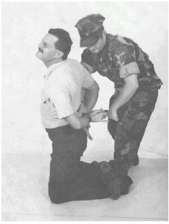 KNEELING HANDCUFF AND SEARCH POSITION 1. With subject facing you, identify yourself and explain that subject is under apprehension. Have subject put his arms straight out, parallel to the deck palms up, feet shoulder width apart. Instruct subject to turn slowly until he is told to stop (approximately 180 degrees). You are looking for telltale signs and bulges that could reveal concealed weapons. Instruct subject to stop turning when he is facing away from you. 2. Have subject place his hands on top of his head, thumbs down, fingers interlaced. Instruct subject to place one knee on the deck. Instruct subject to place his other knee on the deck. Now have subject cross his ankles and sit on them.
