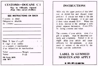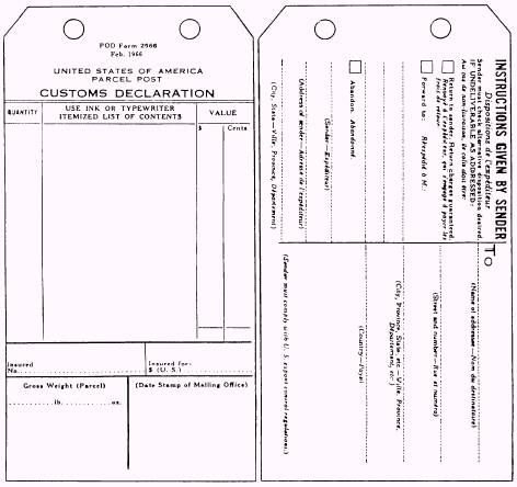 Figure 13-7.-Parcel Post Customs Declaration, PS Form 2966-A. flat on the parcel with the "List of Contents" side face up. Customs declaration forms should be completed in detail with contents descriptively listed and valued by the mailer. Bona Fide Gifts Any person in the CTUS may receive, duty-free, unsolicited gifts through the mails from persons in foreign countries in accordance with the limitations outlined in DOD 5030.49-R. Personal Property Personal property acquired overseas while on extended duty may be imported into the CTUS duty-free and may be mailed. The address side of parcels containing such items is endorsed "Free Entry Claimed Under Public Law 89-436, Movement Order Enclosed," or similar wording. A copy of appropriate PCS orders should be enclosed in the parcel or in an envelope marked "Orders Enclosed" attached thereto. Former Government Property Parcels containing legally acquired items of former Government property, with properly completed customs forms attached, should be mailed with a copy of a sales slip or other evidence of personal ownership. his is necessary to preclude confiscation and return of the items to Government control. |
