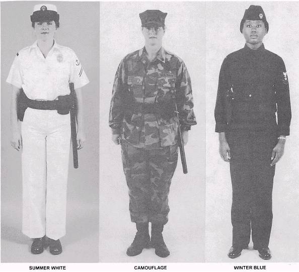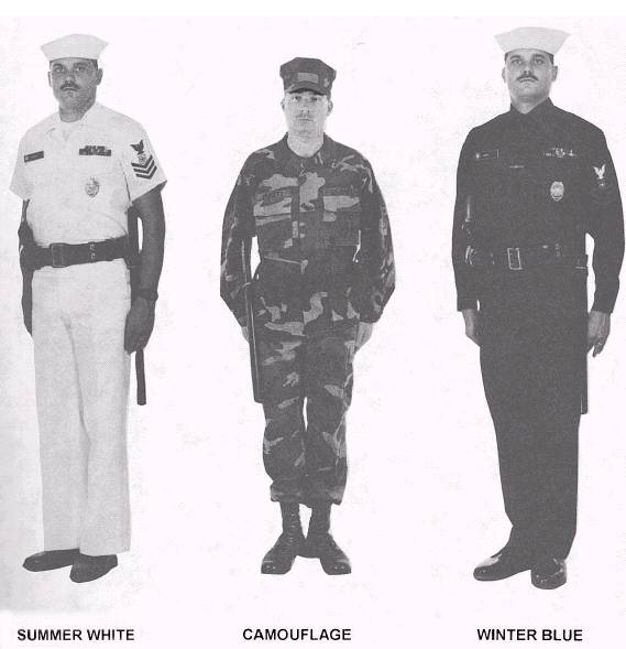 UNIFORMS FOR SECURITY PERSONNEL For male and female enlisted personnel performing duties as base police, corrections personnel, guard personnel, or MAs, the winter blue, summer white, or camouflage uniforms are worn (fig. 1-1). MAs afloat uniforms are determined by local commands. Only authorized outergarments such as peacoats, reefers, raincoats, and windbreakers should be worn 193.127