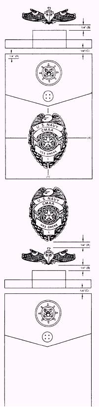 Figure 1-1.-Uniforms for security personnel-Continued. 1-26 insignia, if authorized. If breast insignia, medals and identification badge combined cause the identification badge to be positioned on or below the lower seam of the pocket, do not wear the secondary breast insignia. CORRECT WEAR (WOMEN).- Wear on the left side. Center the badge one-fourth inch above the coat/shirt pocket or above authorized ribbons/breast insignia. See figure 1-2. A standard size badge is available through the supply system and is the only authorized one to be used. See figure 1-3.