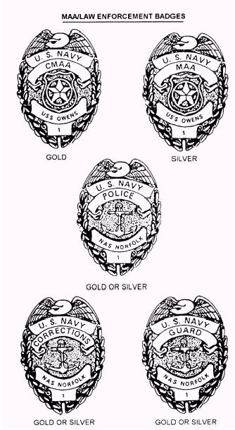 Figure 1-1.-Uniforms for security personnel 1-25 with the appropriate uniforms. For further guidance in the authorized outergarments and the correct wearing of the uniform, refer to chapters 7,8, and 11 of the U.S. Navy Uniform Regulations. Badges MAA/law enforcement badges will be worn by all military personnel who are assigned to an official MAA/law enforcement/physical security or corrections position. CORRECT WEAR (MEN).- Wear on the left side. The badge may be worn on all uniforms except formal and dinner dress. This badge may be worn only during the period of detail. See figure 1-2. The badge should be worn as follows: On pockets with flaps, center the badge between the lower point of the flap and bottom of the pocket, midway between the sides. On pockets without flaps, center the badge on the pocket. On full dress uniforms, center the identification badge on the left pocket one-fourth inch below the lowest row of medals or below the second breast 193.127.1