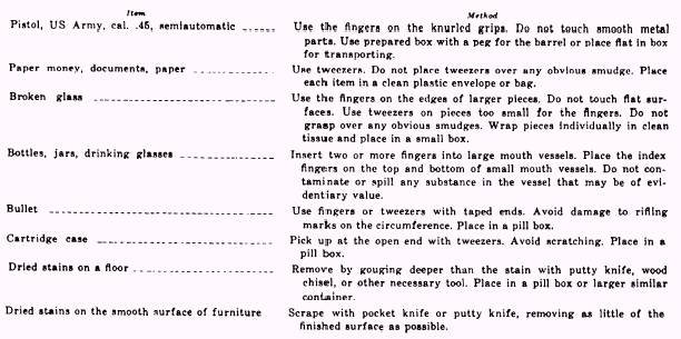 Collecting Evidence Collecting evidence at a scene is usually accomplished after the search has been completed, rough sketch finished, and photographs taken. It may be advisable under certain conditions to collect various fragile items of evidence as they are found For example, items of evidence that would be destroyed by the elements or become contaminated despite protective measures, and those items that would impede further search should be collected when they are located and depicted on the sketch. The essential factor is that evidence be carefully and properly collected. When collecting evidence, handle it as little as possible. Rubber gloves may be used. See table 16-1 for recommended methods for handling specific items that may be collected at a crime scene. If, during the collection of evidence, you touch a piece of evidence and leave your fingerprints on the article, make a note of it and inform the laboratory personnel if they make an examination of the evidence. Your fingerprint card and that of the victim(s) should be forwarded with latent prints to decrease delay of latent identification It may be necessary to damage, partially destroy, or otherwise decrease the effectiveness of an article to collect important evidence. For example, it may be necessary to cut the upholstery on a piece of furniture to obtain an area stained with blood or to cut out a section of a wall to collect fingerprints that cannot be collected by other means. Such action is based on the merits of the individual case. To have a door or window processed at a laboratory or held as evidence, it may be removed from a building. Ensure that necessary measures are taken to protect the contents of a building or room from which a door or window has been removed. When collecting evidence at the scene for laboratory analysis, the amounts needed will depend on the type of evidence and the tests to be conducted Marking Evidence for Identification When marking evidence, place your initials, the date of discovery, and the time on each item of evidence so that it can be identified by you at a later date. These marks should be placed on the item of evidence as soon after discovery as feasible and in a place least likely to