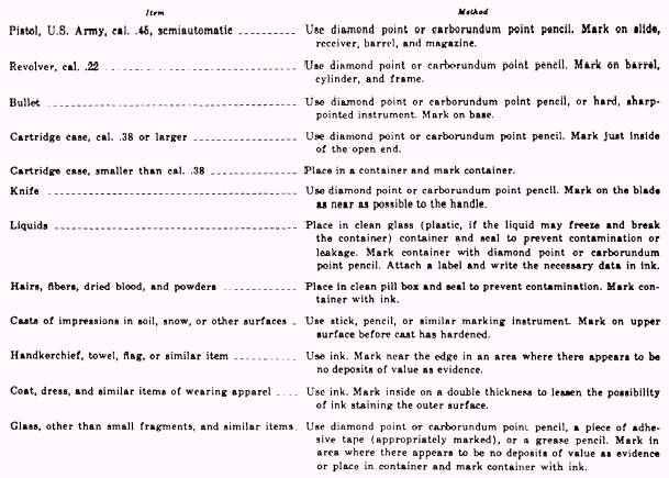 Table 16-2.-Methods for Marking Evidence Evidence, once in your possession, is released only to the evidence custodian or another person designated by your supervisor. The scene is not released until all processing has been completed The release should be effected at the earliest practicable time, particularly in instances in which an activity has been closed or its operations curtailed |