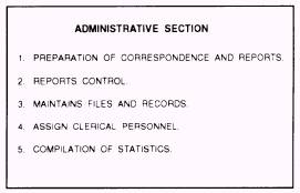 Figure 18-2.-Functional chart of administrative section of a Security department. situation warrants. A plan normally includes a consideration of the general situation, mission, tasks of subordinate units, administrative and logistical matters, and command and communications matters. A program is a course of administrative action devised for the accomplishment of a specific objective according to a time schedule. The specifics of the program include time-phasing, the work to be done, and the means to be allocated for the program's accomplishment. PLANNING Planning is a continuing process The necessity of anticipating future courses of action requires that you make continuing estimates of the current and anticipated situation. Planning must be systematic-a clearly and easily understood routine operation. The planning must conform to the policies and directives of the commanding officer. In the absence of specific or pertinent orders or directives, and pending the approval of the commanding officer, the planning is based upon assumptions that are consistent with sound judgment and a thorough knowledge of the mission. For instance, the planning may be based on the mere anticipation of a forthcoming event, incident, or condition. In the initial stages, some portions of a plan may be based entirely upon assumption. As additional information becomes available, and as the estimate of the situation changes, corresponding modifications should be made in the plan. A developed plan should be flexible and practical, and should be thoroughly coordinated. Requirements for manpower, equipment and supplies, construction, communications, transportation, and similar factors are essential and should be incorporated in the plan. REQUIREMENTS Estimating requirements for a Navy law enforcement operation calls for estimates to be prepared within the scope of the directives and assumptions under which you operate. Units and Personnel The situation and the mission generally determine the law enforcement unit and personnel that are required for the support of an operation. In recommending requirements, you should consider the following: . Capabilities of organic units l Additional support required l Geographic, social, and political aspects of the area of operations l Requirements for riot control, for confinement facilities, and for supporting military government. Equipment The equipment required by security departments to perform their mission is determined by analyzing such factors as the following: l organic equipment of assigned and other available security departments l special equipment needs for riot control and similar needs that may be required l estimated wear-out, maintenance, and replacement rates Facilities The following facilities may be required for the performance of law enforcement operations: . Headquarters for directing security operations l Confinement facilities for military prisoners . Facilities for special activities The number, size, and location of the facilities are determined by analyzing such factors as the following: . Assigned missions; for example, law enforcement, traffic control, and circulation control of individuals l Estimate of military prisoners to be confined In planning the location of law enforcement facilities, every attempt should be made to consolidate functions that reduce administrative overhead. |