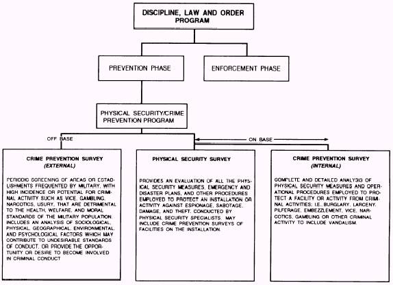 Figure 18-3.-The relationship of physical security and crime prevention surveys. When persons are authorized to be present either in small or large numbers, physical exclusion and detection measures may be largely inappropriate as protective measures. The commanding officer will need to take cognizance of factors that may tend to create temptation or instigate impulsive misconduct in respect to individuals who are authorized to be present. Operational and environmental considerations requiring the presence of significant numbers of personnel are properly subjects of crime prevention surveys in an effort to minimize the number of personnel in critical areas. Limited surveys of civilian establishments or areas frequented by command personnel, to observe type and manner of operations, management attitudes and policies, character of patronage, associated activities, physical conditions, and such other factors that may have an influence upon the welfare and the morale of military personnel may in instances be considered desirable or necessary for the information of the commanding officer. In conducting such surveys, take care to avoid trespass or other violations of private rights and to avoid violation of the Posse Comitatus Act. Obtain permission for entry into nonpublic areas of establishments such as stores, theaters, cafes, and hotel lobbies. The commanding officer has no authority to require cooperation, even the answering of inquiries, on the part of civilian proprietors or authorities. When a crime prevention survey of civilian establishments or areas is planned, primary emphasis should be placed on those establishments that are frequently visited by military personnel. However, that an establishment has a large military clientele should not in itself be used as justification for a survey. In addition, there should be either a record of criminal incidents in the establishment or area, or reasonable grounds to believe that criminal incidents might develop there. Time and available personnel permitting, establishments and areas with a smaller military clientele or only a potential military patronage may also be surveyed. A survey of civilian establishments or areas may develop information on which l a recommendation that it be placed off limits to military personnel can be based; . the commanding officer can base recommendations to the civil authorities regarding the elimination of conditions detrimental to the health, welfare, morale, and integrity of military personnel; l a recommendation for increasing, reducing, establishing, or eliminating patrols can be based; l investigation of offenses committed by persons subject to the Uniform Code of Military Justice (UCMJ) or of offenses against government property under Navy control can be initiated; or l a recommendation can be made to civil authorities that a cooperative, concerted effort be made to eliminate an undesirable situation or increase the availability of wholesome activities and services within the civilian community. |