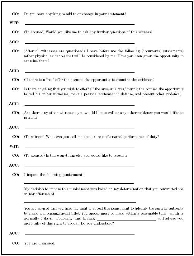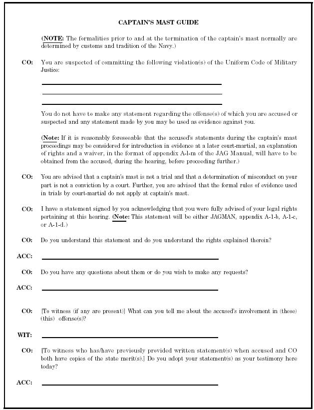 Figure 6-7.-Captain's mast guide-Continued. Normally, the officer who actually holds the nonjudicial punishment hearing is the CO of the accused. COs or OICs are allowed to delegate their authority to hold the hearing to another officer under extraordinary circumstances. These circumstances must be unusual and significant rather than matters of convenience to the commander. This delegation of authority should be in writing and detailed reasons given. This delegation, however, does not include the authority to impose punishment. At such a hearing, the officer delegated to hold the hearing will receive all evidence, prepare a summarized record of matters considered, and send the record to the officer having nonjudicial punishment authority. Burden of Proof The CO must decide that the accused is "guilty" by a preponderance of the evidence. Black's Law Dictionary defines preponderance of evidence as "evidence which is of greater weight or more convincing than the evidence which is offered in opposition to it. . ." Personal Representative The accused is responsible for getting a person to represent him or her at NJP. As a practical matter, the accused is free to choose anyone-a lawyer or nonlawyer, an officer or an enlisted person. The freedom of the accused to choose a representative does not compel the command to provide lawyer counsel, and current regulations do not create a right to counsel at NJP, whereas such a right does exist at a court-martial. Representation by any lawyer who is willing and able to appear at the hearing on behalf of the accused is authorized. While a lawyer's workload may prevent the lawyer from appearing, a blanket rule that no lawyers can appear at Article 15 hearings would appear to contravene the spirit if not the letter of the law. It is likewise doubtful that a lawyer can lawfully be ordered to represent the accused. It is fair to say that the accused can have anyone who is able and willing to appear without cost to the government. While a command does not have to provide a personal representative, it should help the accused get the representative he or she wants. In this connection, if the accused desires a personal representative, allow him or her a reasonable time to get someone. Use good judgment here, for such a period should be neither too short nor too long. Witnesses When the hearing involves controverted questions of fact about the alleged offenses, witnesses should be available to testify if they are present on the same ship or base or are otherwise available at no expense to the government. Thus, in a larceny case, if the accused denies wrongdoing, the witnesses who can testify that an offense was committed should be called to testify in person if they are available at no cost to the government. It should be noted, however, that no authority exists to subpoena civilian witnesses for an NJP proceeding. Public Hearing The accused is entitled to have the hearing open to the public unless the CO determines that the proceeding should be closed for good cause. The CO is not required to make any special arrangements to facilitate public access to the proceedings. Publication of NJP Results Authority to publish the results of nonjudicial punishment is granted by section 0115 of the JAG Manual. You may publish the name, rate, offense(s), and disposition of the offender in the plan of the day (POD). Publish the results not later than 1 month after the imposition of nonjudicial punishment. If the NJP is appealed, publish the results not later than 1 month after the date the appeal is denied. If the POD is distributed to military personnel only, you may include all the details stated previously. If the POD is distributed to other than military personnel, nonjudicial punishment results may be published without the name of the accused. |