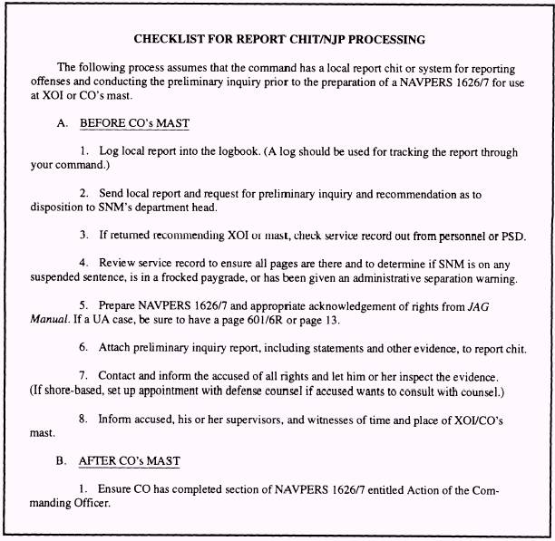 Figure 6-16, checklist for report chit/NJP processing, is provided for you as a guide in helping you to carry out all the responsibilities inherent in nonjudicial punishment proceedings. SUMMARY Nonjudicial punishment is the lowest form of discipline available to COs to aid them in maintaining good order and discipline within the Navy. As you can see from the preceding discussion, there are many things to consider when the various aspects of nonjudicial punishment are carried out. It is important for you, as an MA, to keep abreast of all the requirements and procedures associated with the proper administration of NJP because of its effect upon individuals as well as its effect upon the Navy.