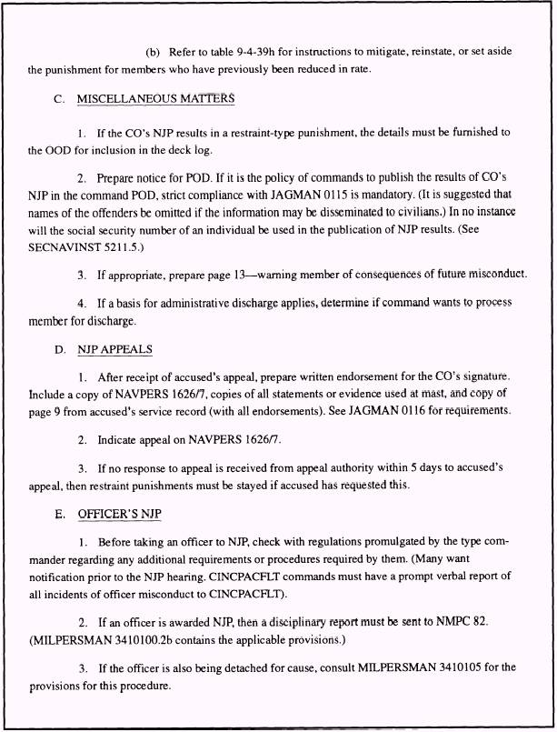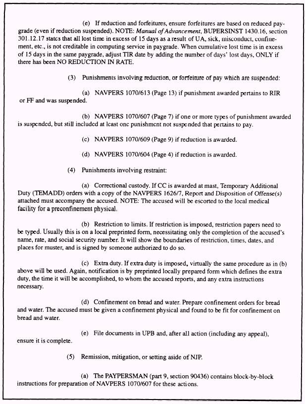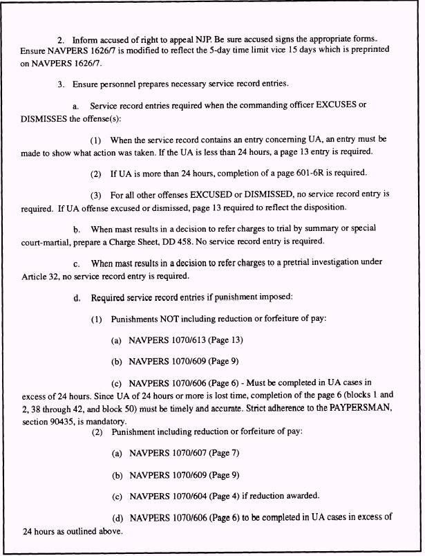 NJP FOR OFFICERS We will now have a brief discussion of the procedures involved when an officer receives nonjudicial punishment as a result of CO's mast. Whenever nonjudicial punishment is imposed upon an officer, the authority imposing the punishment immediately notifies PERS-82 by letter as soon as the results are final. If the officer imposing NJP is not a flag officer, the letter report must be submitted via the first flag officer in the administrative chain of command. These required reports are separate and distinct from any reported NJP that may be contained in investigations or other correspondence. Refer to MILPERSMAN, Article 3410100(2)(b), for the format of the report. UNIT PUNISHMENT BOOK (UPB) The Unit Punishment Book (UPB) contains a record of all NJP hearings conducted by a command, not just those in which punishment was awarded, and is required by MILPERSMAN, Article 5030500. The form that is used to record NJP hearings is the NAVPERS 1626/7. When all actions are resolved on a particular NJP hearing, the space provided in the final administrative action portion of the NAVPERS 1626/7 (section J of figure 6-1) should be completed. This final administrative action indicates when the case record is filed and an entry in the UPB should be made. Though there are no specific instructions as to what manner these cases should be filed in the UPB, the suggested procedure is to file cases in alphabetical order, chronological order by date, or a combination of both. LOG ENTRIES The Standard Organization and Regulations of the U.S. Navy, (SORM), OPNAVINST 3120.32, prescribes the log entry for mast results afloat. Such an entry should be substantially in the format shown previously for the POD entry, and you should provide this information to the officer of the deck (OOD) for inclusion in the deck log. Although there is no Navywide requirement for logbooks ashore, you will find that logs are kept ashore according to local instructions. Unless these local instructions require a