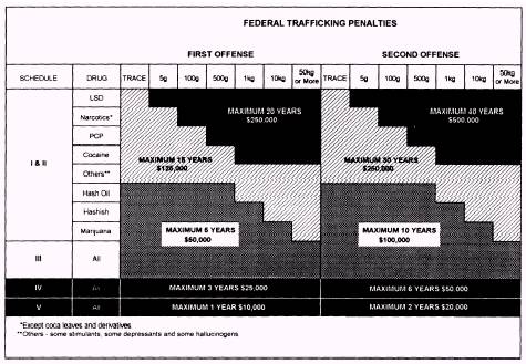 Table 7-3.-Federal Trafficking Penalties age areas. Lesser physical security requirements apply to retail level registrants such as hospitals and pharmacies. All registrants are required to make every effort to make sure controlled substances in their possession are not diverted into the illicit market. This requires operational as well as physical security. For example, registrants are responsible for making sure controlled substances are distributed only to other registrants who are authorized to receive them, or to legitimate patients and consumers. PENALTIES LEARNING OBJECTIVES: Identify the federal trafficking penalties for each schedule of drugs and the various types of marijuana. Explain the penalties provided in terms of quantity and first and second offenses. The FCSA provides penalties for unlawful manufacturing, distribution, and dispensing of controlled substances. The penalties are basically determined by the schedule of the drug or other substance, and sometimes are specified by drug name, as in the case of marijuana. As the statute has been amended since its initial passage in 1970, the penalties have been altered by Congress. The following tables are an overview of the penalties for trafficking or unlawful distribution of controlled substances. This is not inclusive of the penalties provided under the FCSA. See tables 7-3 and 7-4. |
