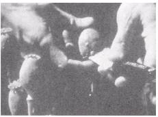 Figure 7.3.-Fluid scraped by hand and air dried to produce opium gum. (fig. 7-3). A more modem method of harvesting is by the industrial poppy straw process of extracting alkaloids from the mature dried plant. The extract may be in liquid, solid, or powder form. Most poppy straw concentrate made available commercially is a fine brownish powder with a distinct odor. OPIUM.- Raw opium (fig. 7-4) has a distinctive and pungent odor. It is most commonly used by smoking in long-stemmed pipes. The user presents a sleepy and relaxed appearance while under the influence of the drug. There is little abuse of opium in the United States.