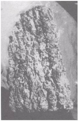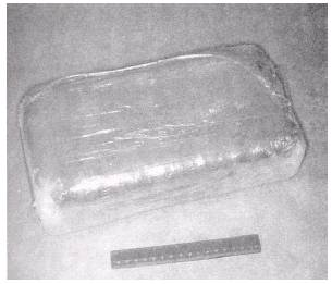 Figure 7-24.-10-pound marijuana brick. Hashish The Middle East is the main source of hashish. Hashish consists of the drug-rich resinous secretions of the cannabis plant that are collected, dried, and then compressed into a variety of forms such as balls, cakes, or cookielike sheets (fig. 7-27). Hashish in the United States varies in potency as in appearance, ranging in THC content from trace amounts up to 10 percent. The average is reported to be 1.8 percent. Hashish Oil The name comes from the drug culture and is a misnomer in suggesting any resemblance to hashish other than its objective of further concentration. Hashish oil (fig. 7-28) is produced by a process of repeated extraction of cannabis plant materials to yield a dark viscous liquid, current samples of which average about 20 percent THC. In terms of its psychoactive effect, a drop or two of this liquid on a cigarette is equal to a single joint of marijuana. |