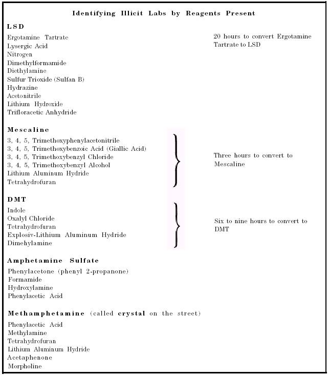 SLANG TERMS FOR DRUGS LEARNING OBJECTIVES: Identify the commonly used slang terms for 11 drugs. The following terms are some of the most commonly used slang terms for drugs: Amphetamines: Bam, Beans, Bennies, Black Beauties, Black Cadillacs, Black Dex, Black Monies, Cartwheels, Chalk, Copilots, Crank, Cross, Crossroads, Crosstops, Crystal, Dexies, Dice, Double Cross, Drivers, Fives, Footballs, Hearts, Leaper, Lightning, Meth, Minibennies, Orange Hearts, Pep Pills, Rippers, Rosas, Roses, Speed, Thrusters, Truck Drivers, Uppers, Wakeups, White Cross, Whites, Yellow Barns, Zetters, Zip Barbiturates: Abbotts, Barbs, Blockbusters, Bluebirds, Blue Devils, Blues, Christmas Trees, Courage Pills, Downers, Golfballs, Gorilla pills, Green Dragons, Lilly, Mexican Reds, Mexican Yellows, Nebbles, Nimbies, Pajaro Rojo, Pink Ladies, Pinks, Rainbows, Red and Blues, Redbirds, Red Devils, Reds, Sleeping Pills, Stumblers, Yellow Jackets, Yellows Cocaine: Big C, Blow C, Candy, Coca, Coke, Flake, Gin, Girl, Gold Dust, Heaven Dust, Incentive, Lady, Lady Snow, Movie Star Drug, Mujer, Nose Candy, Paradise, Perico, Pimp, Polvo Blanco, Snow, Society High, Stardust, White, White Horse Hashish: Black Russian, Goma de Mota, Hash, Soles Heroin: Big H, Big Harry, Blanco, Boy, Brown, Brown Sugar, Caballo, Chiva, Crap, Dirt, Dust, Estuffa, H, Hard Candy, Harry, Heroina, Hombre, Horse, Junk, Mexican Brown, Mexican Mud, Polvo, Stag, Smack, Stuff, Tecata, Thing LSD: Acid, Animal, Blotter Acid, Blue Berkeley, Blue Microdot, California Sunshine, Haze, Microdots, Paper Acid, Purple Haze, Sunshine, Wedges, Windowpanes Marijuana: Acapulco Gold, cannabis, Colombian, Ganja, Grass, Green, Griffa, Hemp, Herb, Hootch, Hooter, J, Jay, Joint, Mary Jane, Mota, Mutah, Panama Red, Pot, Reefer, Rockets, Sativa, Smoke, Stick, Tea, Weed, Yerba Peyote: Bad Seed, Cactus, Mesc, Mescal, Mescal Buttons Methaqualone: Quaalude, Quads, Quas, Soapers, Sopes, Sopor Morphine: Cube, Dust, First Line, Gomma, Miss Emma, Morf, Mofina, Morpho, Morphy, Mud Phencylidine: Angel Dust, Angel Mist, Busy Bee, Crystal, Cyclone, DOA, Dust, Elephant, Goon, Hog, Horse Tranquilizer, Magic Mist, PCP, Peace Pill, Rocket Fuel, Supergrass, Tic Tat, White Horizon, Wobble IDENTIFICATION OF ILLICIT LABORATORIES LEARNING OBJECTIVES: List and explain the reasons for the proliferation of illicit laboratories. Describe a typical clandestine laboratory and the types of drugs produced. During the past 25 years, the demand for psychoactive drugs-stimulants, depressants, and hallucinogens -has spawned a rising incidence of illicit clandestine laboratories. They were first noticed in California and now have been encountered in virtually every other part of the country. Government actions to control the legitimate manufacture and distribution of dangerous drugs also contributed to the growth of these laboratories. Clandestine laboratories have proliferated because of the ease of production and the limited skill needed to operate them. Equipment, chemicals, and facilities are relatively easy and inexpensive to obtain. No great skills are needed to follow the manufacturing procedures. In fact, most laboratory operators employ or are themselves "cooks" rather than trained chemists. The overall risks are minimal despite sporadic fires and explosions and the threat of discovery and arrest. The potential profits from these enterprises can be enormous. Most clandestine laboratories are set up to manufacture a single drug, although several laboratories have been able to manufacture many different ones. The majority of clandestine laboratories are established in rural areas and have relatively modest production capabilities. Occasionally, they are located in suburban or urban areas. Large-scale laboratories are usually set up on rural tracts of land in large outbuildings. In some instances, these laboratories are set up in rented warehouses or other large buildings and are equipped with commercial production facilities capable of producing thousands and even millions of dosage units of controlled substances. Some laboratory operators have been students, teachers, or professional chemists or engineers who have used university or company laboratories for the illicit production of dangerous drugs. Clandestine laboratory operators have produced almost two dozen kinds of controlled substances, including such stimulants as amphetamine, methamphetamine, and cocaine; such depressants as methaqualone and mecloqualone; such narcotic drugs as morphine, heroin, fentanyl/fentanyl analogues, alphaprodine/alphaprodine analogues, methadone, and hashish oil; and a wide variety of hallucinogenic drugs such as PCP, LSD, DET, DMT, MDA, MDMA, TMA, PHP, PCE, DMA, psilocybin, and mescaline, The two most prevalent types of laboratories in recent years have been engaged in the production of methamphetamine and amphetamine. In an attempt to circumvent existing drug laws, some individuals have used clandestine laboratories to synthesize analogues of controlled substances. Known as "designer drugs" in the media, these controlled substance analogues usually retain the pharmacological properties of controlled substances, but, because of slight variations in chemical structure, are not specifically listed as controlled substances. Analogues of potent narcotics, stimulants, depressants, and hallucinogens have been produced in clandestine laboratories. These analogues carry increased health risks due to their unknown purity, toxicity, and potency. The emergency scheduling provisions of the Comprehensive Crime Control Act of 1984 and the Controlled Substance Analogue Enforcement Act of 1986 are aimed at closing the legal loopholes used by individuals who manufacture and distribute these analogues. There are also chemicals that have little or no use other than drug manufacture. The presence of any of them is a strong indication that a drug is being synthesized. See table 7-6. There are many chemicals such as solvents (ether, alc