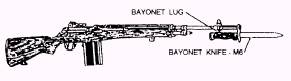 Figure 8-11.-The 7.62-mm M14 rifle with the M6 bayonet knife attached. There are two methods of reloading an empty magazine. Figure 8-14 shows the method with the magazine in the rifle. (This method should only be used in the field, since it creates a possible accidental firing situation.) After the last round is fired from a magazine, the magazine follower will engage the bolt lock and hold the bolt in the rear position. If this fails to happen, make sure you do not have a misfire, then pull the operating handle to the rear and manually depress the bolt lock (located on the left side of the