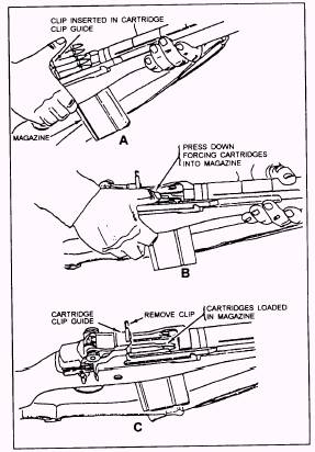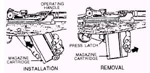 Figure 8-13.-Installation and removal of magazine. receiver), and ease the bolt down against it, then engage the safety. Insert a 5-round clip into the cartridge clip guide, as shown in figure 8-14, and push the cartridges down into the magazine. Four 5-round clips will fully load a magazine. After the last clip is loaded and the clip removed, pull the operating handle to the rear to release the bolt lock, and then release the