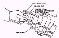 Figure 8-15.-Loading magazine when out of rifle. handle. This will let the bolt go into battery, stripping and feeding the top round into the chamber. The weapon is now ready to fire. When the magazine is out of the rifle, reload as shown in figure 8-15. To load a full magazine into a rifle, insert the front end of the loaded magazine well into the front catch until the front catch snaps into engagement, then pull rearward and upward until the magazine latch locks the magazine into position (fig. 8-13). The rear sight controls consist of a windage knob and pinion assembly (fig. 8-9). The function of the windage knob is to adjust the sight laterally. To move the sight to the right, turn the knob clockwise; to the left, counterclockwise. The pinion assembly adjusts the sight aperture vertically. Turn the pinion clockwise to raise, counterclockwise to lower. |