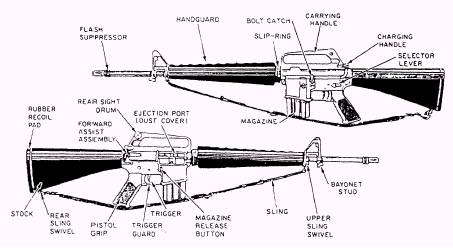 Figure 8-16.-The 5.56-mm M16A1 rifle, left- and right-side views. M16A1 RIFLE The M16A1 rifle (fig. 8-16) is a 5.56-mm (about .223-cal.) magazine-fed, gas-operated, air-cooled shoulder weapon. It is designed for either semiautomatic or fully automatic fire through the use of a selector lever. The M16A1, which is the version in use by the Navy, incorporates a forward assist mechanism. The forward assist was added to allow the operator to completely close the bolt should it hang up while feeding. Heavy use in dirty conditions with the close tolerances of the bolt mechanism combined cause many such feeding problems. A "clothespin" bipod (fig. 8-17) is used in the prone and foxhole positions. The biped is attached to the barrel directly beneath the front sight, between the bayonet lug and the front sling swivel. Clearing the M16A1 Rifle The first consideration in handling any weapon is to make it safe by clearing it. To clear the M16A1 rifle, place the butt against the right thigh and proceed as follows: 1. Attempt to point the selector lever toward SAFE, the position shown in figure 8-18. If the weapon is not cocked, the selector lever cannot be pointed toward SAFE. If this is the case, do not cock the weapon at this time; instead, go on to the next step in clearing. 2. Remove the magazine as shown in figure 8-19. Grasp it with the right hand (fingers curled around the front of the magazine, thumb placed on magazine catch button); apply pressure on the magazine catch button