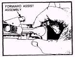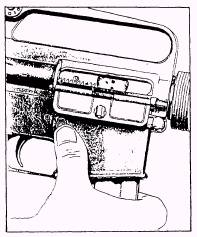 Figure 8-20.-Pulling the charging handle rearward. When the bolt is at the rear, press the bottom of the bolt catch with the thumb or forefinger of the left hand (fig. 8-21). Allow the bolt to move slowly forward until it engages the bolt catch, and return the charging handle to its forward position. 4. Inspect the receiver and chamber of the weapon by looking through the ejection port to ensure that these spaces contain no ammunition. 5. Check the selector lever to ensure that it points toward SAFE, and then allow the bolt to go forward by depressing the upper portion of the bolt catch. CAUTION The selector must be in the SAFE position to prevent damage to the automatic sear. The magazine has a capacity of 20 rounds and may be loaded with any amount up to that capacity. The magazine follower has a raised portion generally resembling the outline of a cartridge. Cartridges are loaded into the magazine so that the tips of the bullets point in the same direction as the raised portion of the follower (fig. 8-22). A magazine charger and magazine charger strip (fig. 8-23) are provided to facilitate loading of the magazine. The magazine charger is connected to the magazine and fully seated. The charger strip is inserted into the magazine charger until fully seated. Pushing on the top cartridge will force cartridges into the magazine. |