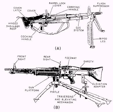 Figure 8-29.-M60 machine gun: (A) Bipod mounted; (B) Tripod mounted. ground troops; however, it is used on many types and classes of ships, river patrol craft, and combat helicopters. Essential features of the M60 are as follows: Length . . . . . . . . . . . . . . . . 43.5 in. (110.5 cm) Weight . . . . . . . . . . . . . . . . 23 lb (10.4 kg) Maximum range . . . . . . . . 3,725 meters (4,075 yd) Maximum effective range . . . . . . . . . . . . . . . . . 1,100 meters (1,200 yd) Ammunition . . . . . . . . . . . 7.62-mm ball tracer, armor-piercing, incendiary, and dummy Rates of fire: Sustained . . . . . . . . . . . . . . 100 rounds per minute Rapid . . . . . . . . . . . . . . . . . 200 rounds per minute Cyclic . . . . . . . . . . . . . . . . 550 rounds per minute The M60 has a front sight permanently affixed to the barrel. The rear sight leaf is mounted on a springtype dovetail base (fig. 8-30). It can be folded forward to the horizontal when the gun is to be moved. The range plate on the sight leaf is marked for each 100 meters, from 300 meters to the maximum effective range of 1100 meters. Range changes may be made by using either the slide release or the elevating knob. The slide release is used for making major changes in elevation. The elevating knob is used for fine adjustments, such as during zeroing. Four clicks on the elevating knob equal a 1-mil change of elevation. The sight is adjustable for windage 5 roils right and left of zero. The windage knob is located on the left side of the sight. One click on the windage knob equals a 1-mil change of deflection. NOTE One mil equals 1 inch at 1000 inches, 1 yard at 1000 yards, 1 meter at 1000 meters, etc. A safety lever is located on the left side of the trigger housing. It has an S (SAFE) and an F (FIRE) position. On the SAFE position the bolt cannot be pulled to the rear or released to go forward. The cocking lever, on the right side of the gun, is used to pull the bolt to the rear. It must be returned manually to its forward position each time the bolt is manually pulled to the rear.