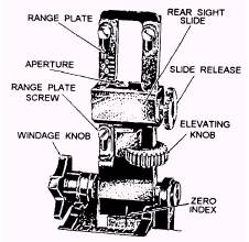 Figure 8-30.-M60 rear sight. OPERATION The machine gun is designed to function automatically as long as ammunition is fed into the gun and the trigger is held to the rear. Each time a round is fired, the parts of the machine gun function in a certain sequence. Many of the actions occur simultaneously and are only separated for teaching purposes. The sequence of operation is known as the cycle of operation. The cycle starts by putting a round in the feed tray groove and then pulling the trigger, releasing the sear from the sear notch (fig. 8-31). It stops when the trigger is released and the sear again engages the sear notch in the operating rod. When the trigger is held to the rear, the rear of the sear is lowered and disengaged from the sear notch. This allows the operating rod and bolt to be driven forward by the expansion of the operating rod spring. Now that the gun is functioning, the steps of the cycle can be traced. As the bolt begins its forward movement, the feed cam is forced to the right, causing the feed cam lever to pivot in the opposite direction and forcing the feed pawl over the next round in the belt, ready to place it in the feed tray groove when the rearward action occurs again. As the bolt moves to the rear (fig. 8-32) after the firing, the cam roller on the top of the bolt forces the feed cam to the left. The feed cam lever is forced to pivot, moving the feed pawl to the right, placing a round in the feed tray groove. As the bolt travels forward, the upper locking lug engages the rim of the cartridge. The pressure of the front and rear cartridge guides hold the round so that