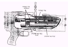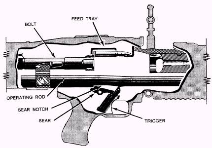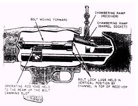 Figure 8-33.-Chambering. independently of the bolt, for a short distance. The yoke, engaged between the firing pin spools, carries the firing pin forward. The striker of the firing pin protrudes through the aperture in the face of the bolt, strikes the primer of the cartridge and detonates it. This action is depicted in figure 8-35. After the cartridge is ignited and the projectile passes the gas port, part of the expanding gases enter the gas cylinder through the gas port. The rapidly expanding gases enter the hollow gas piston as shown in figure 8-36, and force the piston to the rear. The operating rod, being in contact with the piston, is also pushed to the rear. As the operating rod continues to the rear, the operating rod yoke acts against the bolt camming slot to cause the bolt to begin its counter- clockwise rotation. The upper and lower locking lugs of the bolt, contacting the bolt caroming surfaces in- side the barrel socket, cause the bolt to complete its one-quarter turn rotation (counterclockwise) and un- lock the bolt from the barrel socket. Unlocking begins as the yoke of the operating rod contacts the curve of the bolt caroming slot, and ends as the bolt clears the end of the barrel socket. While unlocking is going on, extraction is beginning. The rotation of the bolt (in unlocking) loosens the cartridge case in the chamber. As the operating rod and bolt continue to the rear, the extractor (gripping the rim of the cartridge) pulls the cartridge case from the chamber. As the case is withdrawn from the chamber, the ejector spring expands. The ejector presses on the base of the cartridge case, forcing the front of the spent case against the right side of the receiver, as shown in figure 8-37. As the bolt continues to the rear, the action of the ejector pushing against the base of the cartridge case and the extractor gripping the right side of the case cause