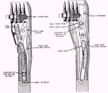 Figure 8-32.-Feeding. positive contact is made with the upper locking lug of the bolt. The front cartridge guide prevents the link's forward motion as the round is stripped from the belt, The upper locking lug carries the round forward, and the cambering ramp causes the nose of the cartridge to be caromed downward into the chamber as shown in figure 8-33. When the round is fully seated in the chamber, the extractor snaps over the rim of the cartridge, and the ejector on the face of the bolt is depressed. As the round is chambered, the bolt enters the barrel socket. The upper and lower locking lugs contact the bolt caroming surfaces inside the barrel socket and start the rotation of the bolt clockwise. The action of the operating rod yoke against the bolt caroming slot, as the operating rod continues forward, causes the bolt to complete its one-quarter turn clock- wise rotation (fig. 8-34). Locking is then completed. After the bolt reaches its fully forward and locked position, the operating rod continues to go forward,