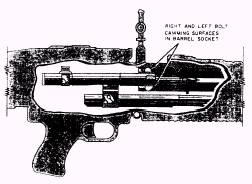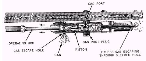 Figure 8-36.-Unlocking action of gases. the cartridge case to spin from the gun as the case reaches the ejection port. The empty link is forced out of the link ejection port as the rearward movement of the bolt causes the next round to be positioned in the feed plate groove. As the expanding gases force the gas piston to the rear, the operating rod is initially moved independently of the bolt. The yoke of the operating rod acts against the rear firing pin spool, withdrawing the firing pin from the primer of the spent cartridge case. The action of the operating rod yoke continuing to the rear against the rear firing pin spool fully compresses the firing pin spring. As long as the trigger is held to the rear, the weapon will continue to complete the first seven steps of functioning automatically. When the trigger is released and the sear again engages the sear notch, the cycle of functioning is stopped and the weapon is cocked.