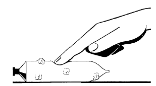 Figure 10-5.-Pressure to a fluid transmits in all directions. PRINCIPLES OF HYDRAULIC PRESSURE A Frenchman named Pascal discovered that a pressure applied to any part of a confined fluid transmits to every other part with no loss. The pressure acts with equal force on all equal areas of the confining walls and perpendicular to the walls. Remember when you are talking about the hydraulic machine, you are talking about the way a liquid acts in a closed system of pipes and cylinders. The action of a liquid under such conditions is somewhat different from its behavior in open containers or in lakes, rivers, or oceans. You also should keep in mind that you cannot compress most liquids into a smaller space. Liquids dont "give" the way air does when you apply pressure, nor do liquids expand when you remove pressure. Punch a hole in a tube of toothpaste. If you push down at any point on the tube, the toothpaste comes out of the hole. Your force has transmitted from one place to another through the toothpaste, which is a thick, liquid fluid. Figure 10-5 shows what would happen if you punched four holes in the tube. If you were to press on the tube at one point, the toothpaste would come out of all four holes. You have illustrated a basic principle of hydraulic machines. That is, a force applied on a liquid transmits equally in every direction to all parts of the container. We use this principle in the operation of four-wheel hydraulic automobile brakes. Figure 10-6 is a simplified drawing of this brake system. You push down on the brake pedal and force the piston in the master cylinder against the fluid in that cylinder. This push sets up a pressure on the fluid as your finger did on the toothpaste in the tube. The pressure on the fluid in the master cylinder transmits through the lines to the brake cylinders in each wheel. This fluid under pressure