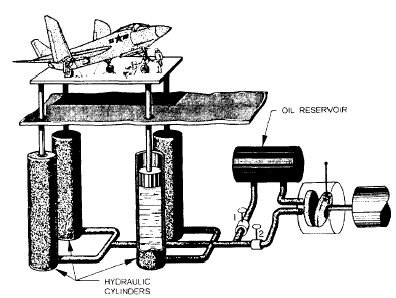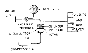 Figure 10-14.-Controlling fluid pressure. hydraulically by remote control, although in an emergency they may operate manually. Hydraulics are used in many other ways aboard submarines. They are used to raise and lower the periscope. The submarines are steered and the bow and stern planes are controlled by hydraulic systems. The windlass and capstan system, used in mooring the submarine, is hydraulically operated. You will find many more applications of hydraulics aboard the submarine. Controlling Fluid Pressure In some hydraulic systems, oil is kept under pressure in a container known as an accumulator. As shown in figure 11-14, the accumulator is a large cylinder; oil is pumped into it from the top. A free piston divides the cylinder into two parts. Compressed air is forced into the cylinder below the piston at a pressure of 600 psi. Oil is then forced into it on top of the piston. As the pressure above it increases, the piston is forced down, squeezing the air into a smaller space. Air is elastic; you can compress it under pressure, and it will expand as soon as the pressure is reduced. When oil pressure is reduced, large quantities of oil under working pressure are instantly available to operate hydraulic rams or motors any place on the submarine. SUMMARY The Navy uses many devices whose operation depends on the hydrostatic principle. You should remember three points about the operation of these devices: Pressure in a liquid is exerted equally in all directions. Hydrostatic pressure refers to pressure at any depth in a liquid that is not flowing. Pressure depends upon both depth and density. The formula for finding pressure is P= H x DThe working principle of all hydraulic mechanisms is simple enough. Whenever you find an application that seems hard to understand, keep these points in mind: is the term applied to the behavior of enclosed liquids. Machines that operate liquids under pressure are called hydraulic machines.Liquids are incompressible. They cannot be squeezed into spaces smaller than they originally occupied. A force applied on any area of a confined liquid transmits equally to every part of that liquid. In hydraulic cylinders, the relation between the force exerted by the large piston to the force applied on the smaller piston is the same as the relationship between the area of the larger piston and the area of the smaller piston. Some of the advantages of hydraulic machines are: We use tubing to transmit forces, and tubing can readily transmit forces around corners. Tubing requires little space. Few moving parts are required. |
