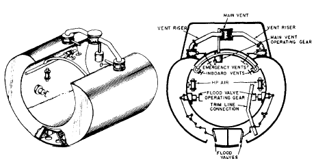 Figure 10-13.-Submarine special ballast tank (safety tank). compressed air. Sufficient air is left trapped in the tanks to prevent the seawater from reentering. We use other tanks, such as variable ballast tanks and special ballast tanks (for example, the negative tank, safety tank, and bow buoyancy tank), either for controlling trim or stability or for emergency weight-compensating purposes. The variable ballast tanks have no direct connection to the sea. Therefore, we must pump water into or out of them. The negative tank and the safety tank can open to the sea through large flood valves. These valves, as well as the vent valves for the main ballast tanks and those for the safety and negative tanks, are all hydraulically operated. The vents and flood valves are outside the pressure hull, so some means of remote control is needed to open and close them from within the submarine. We use hydraulic pumps, lines, and rams for this purpose. Oil pumped through tubing running through the pressure hull actuates the valves operating mechanisms by exerting pressure on and moving a piston in a hydraulic cylinder. Operating the valves by a hydraulic system from a control room is easier and simpler than doing so by a mechanical system of gears, shafts, and levers. The hydraulic lines can be readily led around corners and obstructions, and a minimum of moving parts is required. Figure 10-13 is a schematic sketch of the safety tank-one of the special ballast tanks in a submarine. The main vent and the flood valves of this tank operate