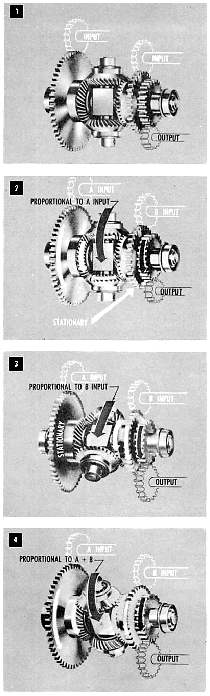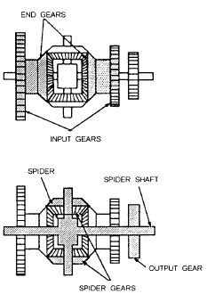 Figure 11-11.How a differential works. Now lets look at figure 11-11. In this hookup the two end gears are positioned by the input shafts, which represent the quantities to be added or subtracted. The spider gears do the actual adding and subtracting. They follow the rotation of the two end