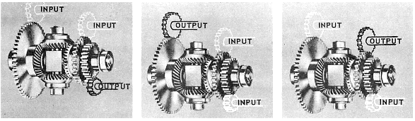 Figure 11-13.Differential gear hookups. will be equal to half the difference between the revolutions of the two inputs. A change in the gear ratio to the output shaft can then give us any proportional answer we wish. We have been describing a hookup wherein the two sides are inputs and the spider shaft is the output. As long as you recognize that the spider follows the end gears for half the sum, or difference, of their revolutions, you dont need to use this type of hookup. You may use the spider shaft as one input and either of the sides as the other. The other side will then become the output. Therefore, you may use three different hookups for any given differential, depending on which is the most convenient mechanically, as shown in figure 11-13. In chapter 13 of this book, we will describe the use of the differential gear in the automobile. Although this differential is similar in principle, you will see that it is somewhat different in its mechanical makeup. |