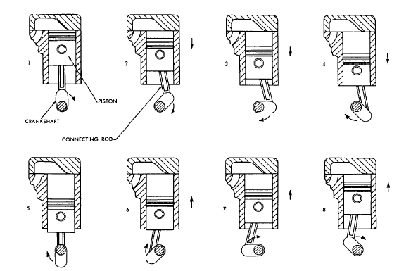 Figure 12-3.-Relationship of piston, connecting rod, and crank on crankshaft as crankshaft turns one revolution. Since similar action occurs in all cylinders of an engine, we will describe the use one cylinder in the development of power. The one-cylinder engine consists of four basic parts: cylinder, piston, connecting rod, and crankshaft (shown in fig. 12-2). The cylinder, which is similar to a tall metal can, is closed at one end. Inside the cylinder is the piston, a movable metal plug that fits snugly into the cylinder, but can still slide up and down easily. This up-and-down movement, produced by the burning of fuel in the cylinder, results in the production of power from the engine. You have already learned that the up-and-down movement is called reciprocating motion. This motion must be changed to rotary motion to rotate the wheels or tracks of vehicles. This change is accomplished by a crank on the crankshaft and a connecting rod between the piston and the crank. The crankshaft is a shaft with an offset portion-the crank that describes a circle as the shaft rotates. The top end of the connecting rod connects to the piston and must therefore go up and down. Since the lower end of the connecting rod attaches to the crankshaft, it moves in a circle; however it also moves up and down. When the piston of the engine slides downward because of the pressure of the expanding gases in the cylinder, the upper end of the connecting rod moves downward with the piston in a straight line. The lower end of the connecting rod moves down and in a circular motion at the same time. This moves the crank; in turn, the crank rotates the shaft. This rotation is the desired result. So remember, the crankshaft and connecting rod combination is a mechanism for changing straight-line, up-and-down motion to circular, or rotary, motion.BASIC ENGINE STROKES Each movement of the piston from top to bottom or from bottom to top is called a stroke. The piston takes two strokes (an upstroke and a downstroke) as the crankshaft makes one complete revolution. When the piston is at the top of a stroke, it is said to be at top dead center. When the piston is at the bottom of a stroke, it is said to be at bottom dead center. These positions are rock positions, which we will discuss further in this chapter under "Timing." See figure 12-3 and figure 12-7. The basic engine you have studied so far has had no provisions for getting the fuel-air mixture into the cylinder or burned gases out of the cylinder. The
