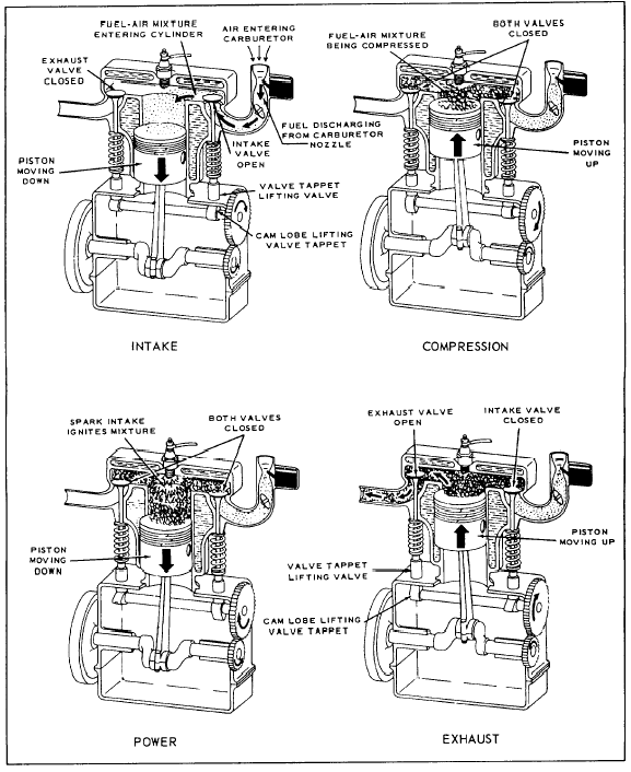 Figure 12-4.-Four-stroke cycle in a gasoline engine. enclosed end of a cylinder has two openings. One of the openings, or ports, permits the mixture of air and fuel to enter, and the other port permits the burned gases to escape from the cylinder. The two ports have valves assembled in them. These valves, actuated by the camshaft, close off either one or the other of the ports, or both of them, during various stages of engine operation. One of the valves, called the intake valve, opens to admit a mixture of fuel and air into the cylinder. The other valve, called the exhaust valve, opens to allow the escape of burned gases after the fuel-and-air mixture has burned. Later you will learn more about how these valves and their mechanisms operate. The following paragraphs explain the sequence of actions that takes place within the engine cylinder: the intake stroke, the compression stroke, the power stroke, and the exhaust stroke. Since these strokes are easy to identify in the operation of a four-cycle engine, that engine is used in the description. This type of engine is called a four-stroke-Otto-cycle engine, named after Dr. N. A. Otto who, in 1876, first applied the principle of this engine. |