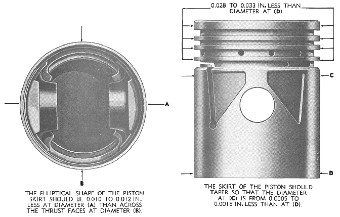 Figure 12-16.Cam-ground piston. The piston is kept in alignment by the skirt, which is usually cam ground (elliptical in cross section) (fig.12-16). This elliptical shape permits the piston to fit the cylinder, regardless of whether the piston is cold or at operating temperature. The narrowest diameter of the piston is at the piston pin bosses, where the piston skirt is thickest. At the widest diameter of the piston, the piston skirt is thinnest. The piston is fitted to close limits at its widest diameter so that the piston noise (slap) is prevented during the engine warm-up. As the piston is