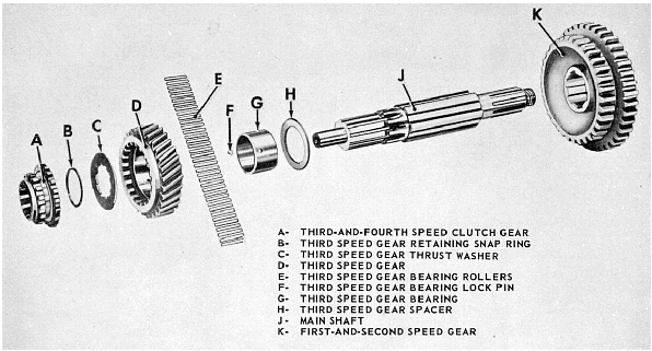Figure 13-8.Dissembled main shaft assembly. (fig. 13-8, A) toward the third-speed gear (fig. 13-8, D). This action engages the external teeth of the clutch gear with the internal teeth of the third-speed gear. Since the third-speed gear is rotating with the rotating counter-shaft gear, the clutch gear also must rotate. The clutch gear is splined to the main shaft, and therefore, the main shaft rotates with the clutch gear. This principle is carried out when the shift lever moves from one speed to the next. Constant-mesh gears are seldom used for all speeds. Common practice is to use such gears for the higher gears, with sliding gears for first and reverse speeds, or for reverse only. When the shift is made to first or reverse, the first and reverse sliding gear is moved to the left on the main shaft. The inner teeth of the sliding gear mesh with the main shaft first gear. SYNCHROMESH TRANSMISSION The synchromesh transmission is a type of constant-mesh transmission. It synchronizes the speeds of mating parts before they engage to allow the selection of gears without their clashing. It employs a combination metal-to-metal friction cone clutch and a dog or gear positive clutch. These clutches allow the main drive gear and second-speed main shaft gear to engage with the transmission main shaft. The friction cone clutch engages first, bringing the driving and driven members to the same speed, after which the dog clutch engages easily without clashing. This process is accomplished in one continuous operation when the driver declutches and moves the control lever in the usual manner. The construction of synchromesh transmissions varies somewhat with different manufacturers, but the principle is the same in all. The construction of a popular synchromesh clutch is shown in figure 13-9. The driving member consists of a sliding gear splined to the transmission main shaft with bronze internal cones on each side. It is surrounded by a sliding sleeve having internal teeth that are meshed with the external teeth of the sliding gear. The sliding sleeve has grooves around the outside to receive the shift fork. Six spring-loaded balls in radially drilled holes in the gear fit into an internal groove in the sliding sleeve. That prevents the sliding sleeve from moving endwise relative to the gear until the latter has reached the end of its travel. The driven members are the main drive gear and second-speed main shaft gear. Each has external cones and external teeth machined on its sides to engage the internal cones of the sliding gear and the internal teeth of the sliding sleeve. The synchromesh clutch operates as follows: when the driver moves the transmission control lever to the third-speed, or direct-drive, position the shift fork moves the sliding gear and sliding sleeve forward as a unit until the internal cone on the sliding gear engages the external cone on the main drive gear. This action brings the two gears to the same speed and stops endwise travel of the sliding gear. The sliding sleeve slides over the balls and silently engages the external teeth on the main drive gear. This action locks the main drive gear and transmission main shaft together as shown in