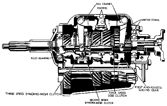 Figure 13-10.-Synchromesh transmission arranged for steering column control. figure 13-9. When the transmission control lever is shifted to the second-speed position, the sliding gear and sleeve move rearward. The same action takes place, locking the transmission main shaft to the second-speed main shaft gear. The snchromesh clutch is not applied to first speed or to reverse. First speed is engaged by an ordinary dog clutch when constant mesh is employed by a sliding gear. Figure 13-10 shows a cross section of a