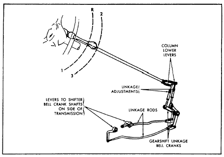 Figure 13-11.-Steering colunn transmission control lever and linkage. synchromesh transmission that uses constant-mesh helical gears for the three forward speeds and a sliding spur gear for reverse.Some transmissions are controlled by a steering column control lever (fig. 13-11). The positions for the various speeds are the same as those for the vertical control lever except that the lever is horizontal. The shifter fork is pivoted on bell cranks that are turned by a steering column control lever through the linkage shown. The poppets shown in figure 13-10 engage notches at the inner end of each bell crank. Other types of synchromesh transmissions controlled by steering column levers have shifter shafts and forks moved by a linkage similar to those used with a vertical control lever. |
