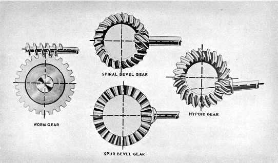 Figure 13-17.Gears used in final drives. upward or downward movement of the axle, as the springs flex, shortens or lengthens the distance between the axle assembly and the transmission. This changing distance is compensated for by a slip joint placed at one end of the propeller shaft. The usual type of slip joint consists of a splined stub shaft, welded to the propeller shaft, that fits into a splined sleeve in the universal joint. A slip joint and universal joint are shown in figure 13-16. Universal joints are double-hinged with the pins of the hinges set at right angles. They are made in many different designs, but they all work on the same principle. (See chapter 11.) |