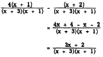 Factoring the denominator of the second fraction, we find that the LCD is (x + 3)(x + 1). Rewriting the original fractions with the LCD as denominator, we may now combine the fractions as follows: