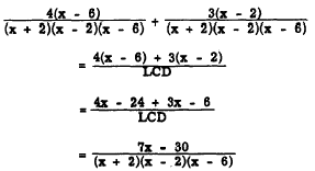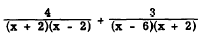 and the LCD is (x + 2)(x - 2)(x - 6). Rewriting the fractions with this denominator and adding numerators, we have the following expression: