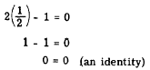 An identity is established when both sides of the equality have been reduced to the same number or the same expression. When 5 is substituted for x, the value of either side of 6(x-3) = 6x - 18 is 12. When -10 is substituted for x, the value on either side is -78. The fact that this equality is an identity can be shown also by factoring the right side so that the equality becomes6(x-3) = 6(x-3) The expressions on the two sides of the equality are identical.CONDITIONAL EQUATIONS A statement such as 2x - 1 = 0 is an equality only when x has one particular value. Such a statement is called a CONDITIONAL EQUATION, since it is true only under the condition that x = 1/2. Likewise, the equation y - 7 = 8 holds true only if y = 15.The value of the variable for which an equation in one variable holds true is a ROOT, or SOLUTION, of the equation. When we speak of solving equations in algebra, we refer to conditional equations. The solution of a conditional equation can be verified by substituting for the variable its value, as determined by the solution.The solution. is correct if the equality reduces to an identity. For example, if 1/2 is substituted for x in 2x - 1 = 0, the result is