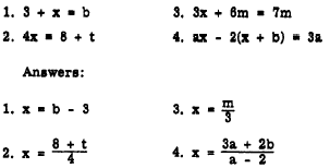 EQUATIONS WITH LITERAL COEFFICIENTSAs stated earlier, the first letters of the alphabet usually represent known quantities (constants), and the last letters represent unknown quantities (variables). Thus, we usually solve for x, y , or 2.An equation such as ax - 8 = bx - 5 has letters as coefficients. Equations with literal coefficients are solved in the same way as equations with numerical coefficients, except that when an operation cannot actually be performed, it merely is indicated.In solving for x in the equation ax - 8 =bx-5 subtract bx from both members and add 8 to both members. The result isax - bx = 8 - 5 Since the subtraction on the left side cannot actually be performed, it is indicated. The quantity, a - b, is the coefficient of x when terms are collected. The equation takes the form(a - b) x = 3 Now divide both sides of the equation by a-b. Again the result can be only indicated. The solution of the equation is
